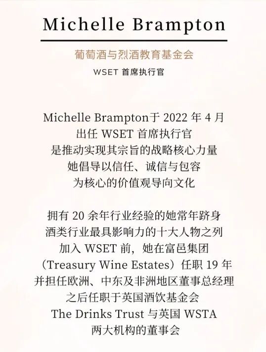 这些问题,正是葡萄酒与烈酒教育基金会(WSET)的首席执行官 Michelle Brampton (米歇尔·布兰普顿) 的思考。在 Michelle看来,教育远不止于知识的传授——它是一种文化的重建,是价值的传承,更是信任的纽带。